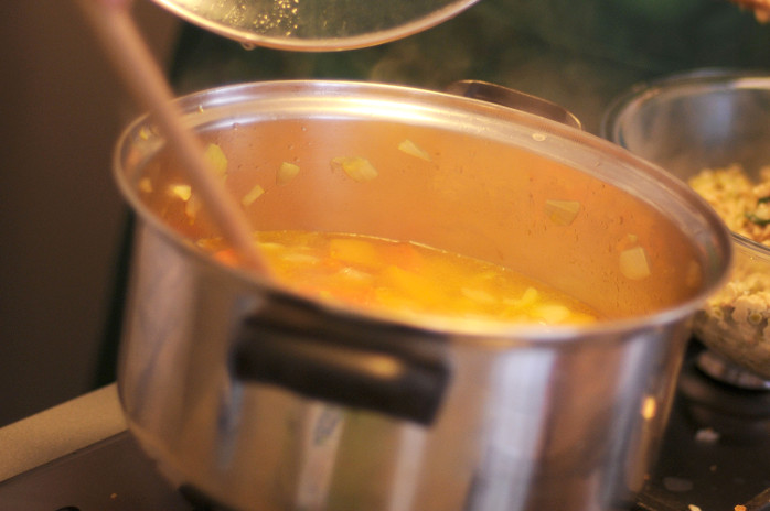 - Miješajte dok ne postane glatko. Ako je juha gusta, možete dodati malo više kipuće vode.
